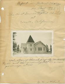 In sorting through lots of photos and documents, I came across this handwritten report by Karen’s uncle. It may have been an assignment for a seminary class as Uncle Harry was the pastor who performed our wedding ceremony.The only date is indicated as around 1925. The subject concerns the German Baptist Church in a small southern San Joaquin valley town.