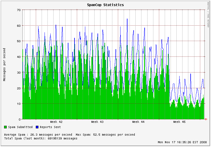 Ars Technica reports the spam oriented ISP McColo has been grounded due to some great work by The Washington’s Post Security Fix blog team. This data from SpamCop shows it had a big effect. Who knows how long it will last though.
