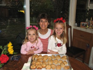 Thanksgiving dinner prepWe make our Thanksgiving family get together a big deal, centered around a yummy meal of traditional items. Preparations are actively underway. Yesterday, the girls came over to help make a big batch of yeast rolls. Despite our tendency to smother them with butter and honey and devour them on the spot, I think enough got put away for our special meal on Thanksgiving day.