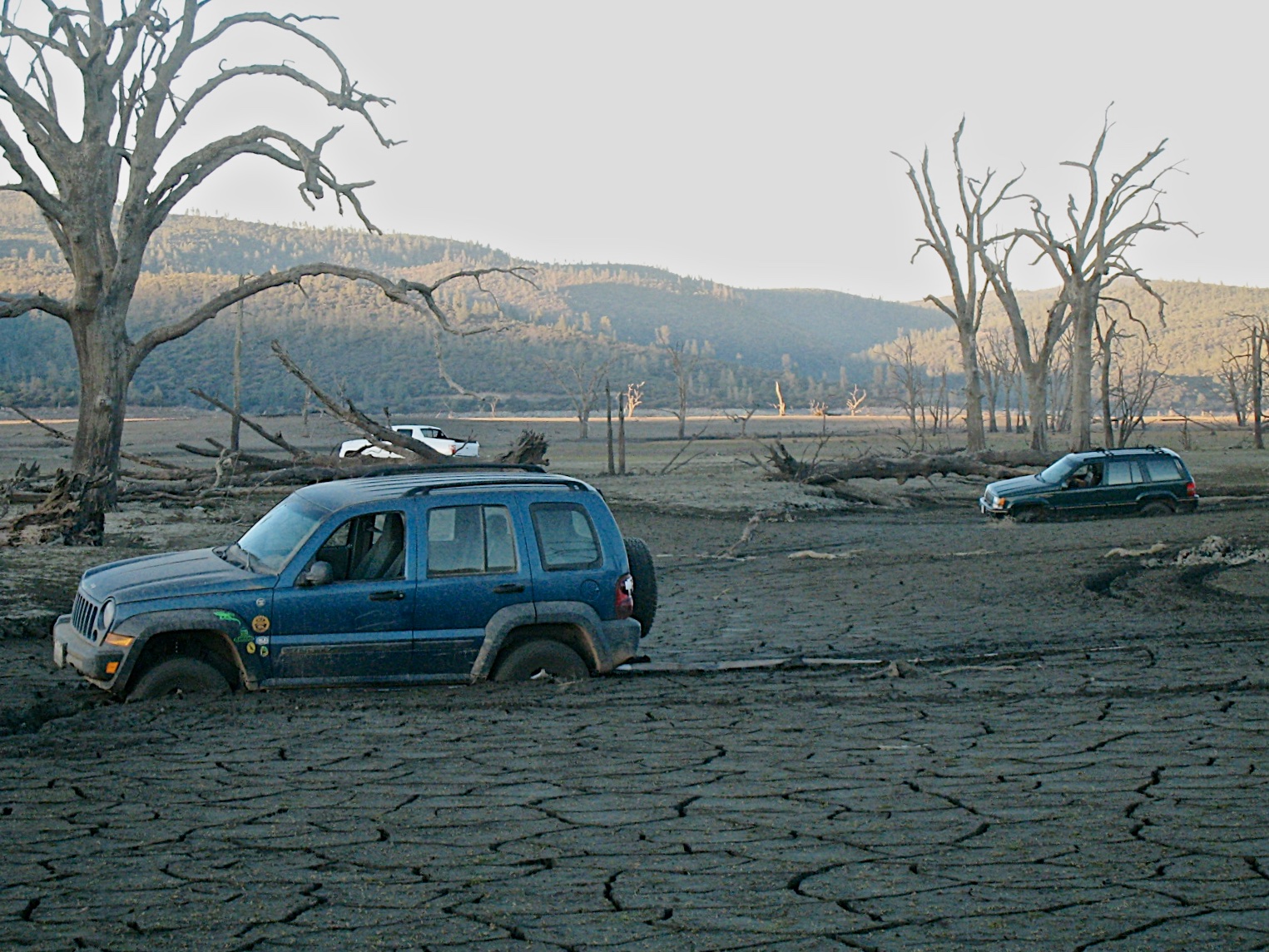 As we proceeded on we drove by Indian Valley Reservoir, which was extremely low. Noticing there was a terrain 5 kayak cache near the normal lake shore, we decided to drive out on the dry lake bottom and see how close we could get. We did fine getting there and finding the cache. But then the adventure started.