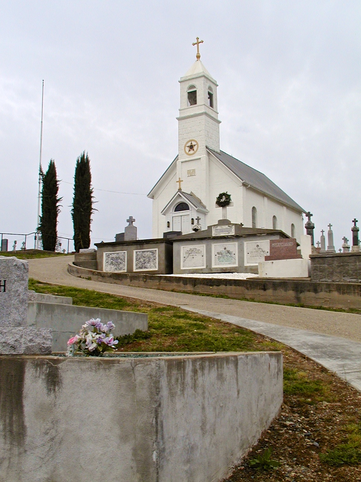 Next I drove out to a modern day cemetery on highway 88 which was well maintained and very interesting. The cache, Sunset View, was easy to find (1:58 PM), but I spent quite a bit of time taking pictures and talking with a visitor who really seemed to want to talk.It was time to start back for Pine Grove, but I made one stop in Jackson to hunt for SOSO. This was a great photo op. After I had taken a couple, I checked the GPSr to see where to go, and it was zeroed. So I just looked, and there it was. It’s a magnetic nano-cache on the fence. Since this church was marked as historic, I thought I might be able to claim the Time to find something Historic! locationless cache. After getting home and checking, it had not been claimed yet, so this was a two for one stop.