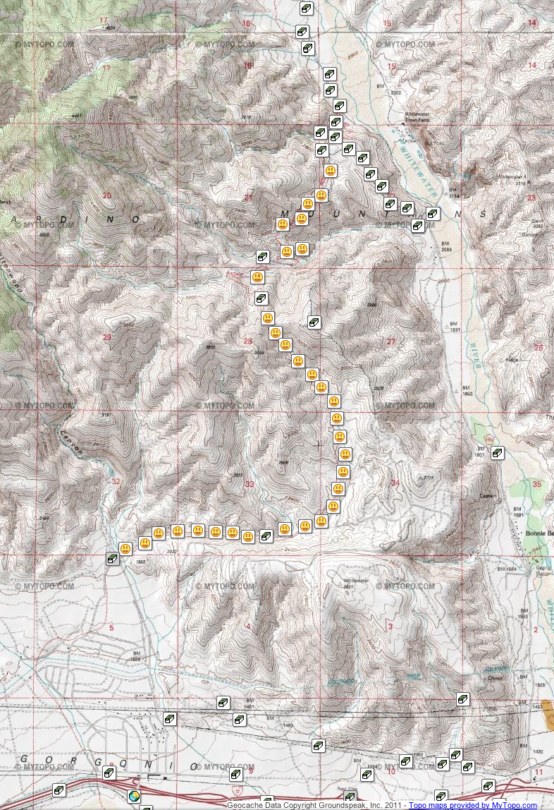 I got to the trailhead later than I intended because it seems I always underestimate how long it will take me to get organized, have breakfast, and drive. It also took me longer to find some of the caches than I estimated. I got close; I could see the Whitewater River and hear the water, but I adhered to my turn-around schedule and made it back to the trailhead just after sundown.