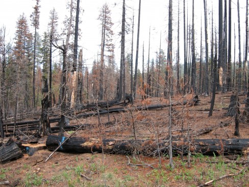 So now the scene will look more like this photo from 2007 of the then recent Black Crater fire. I’m guessing that where the fire burned hottest in the dead wood there won’t be any live trees left, unlike this photo. The forest will regenerate. We hiked near Three Finger Jack through an area burned in 2003 and the new pines are 3 to 4 feet tall, so in 20 years or so this area will be a nice young forest. For a few years, though, it will be a huge scar and not very pretty.