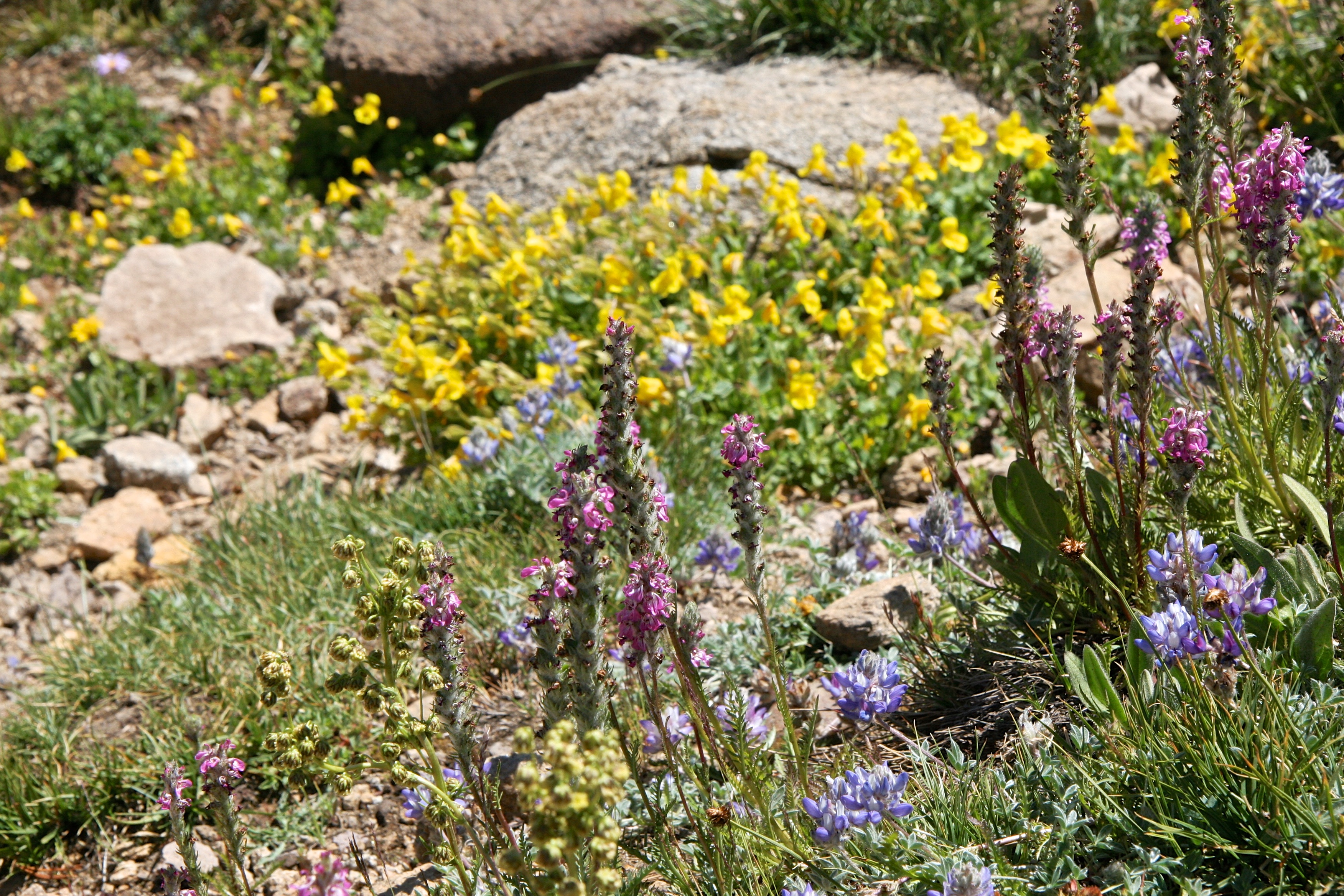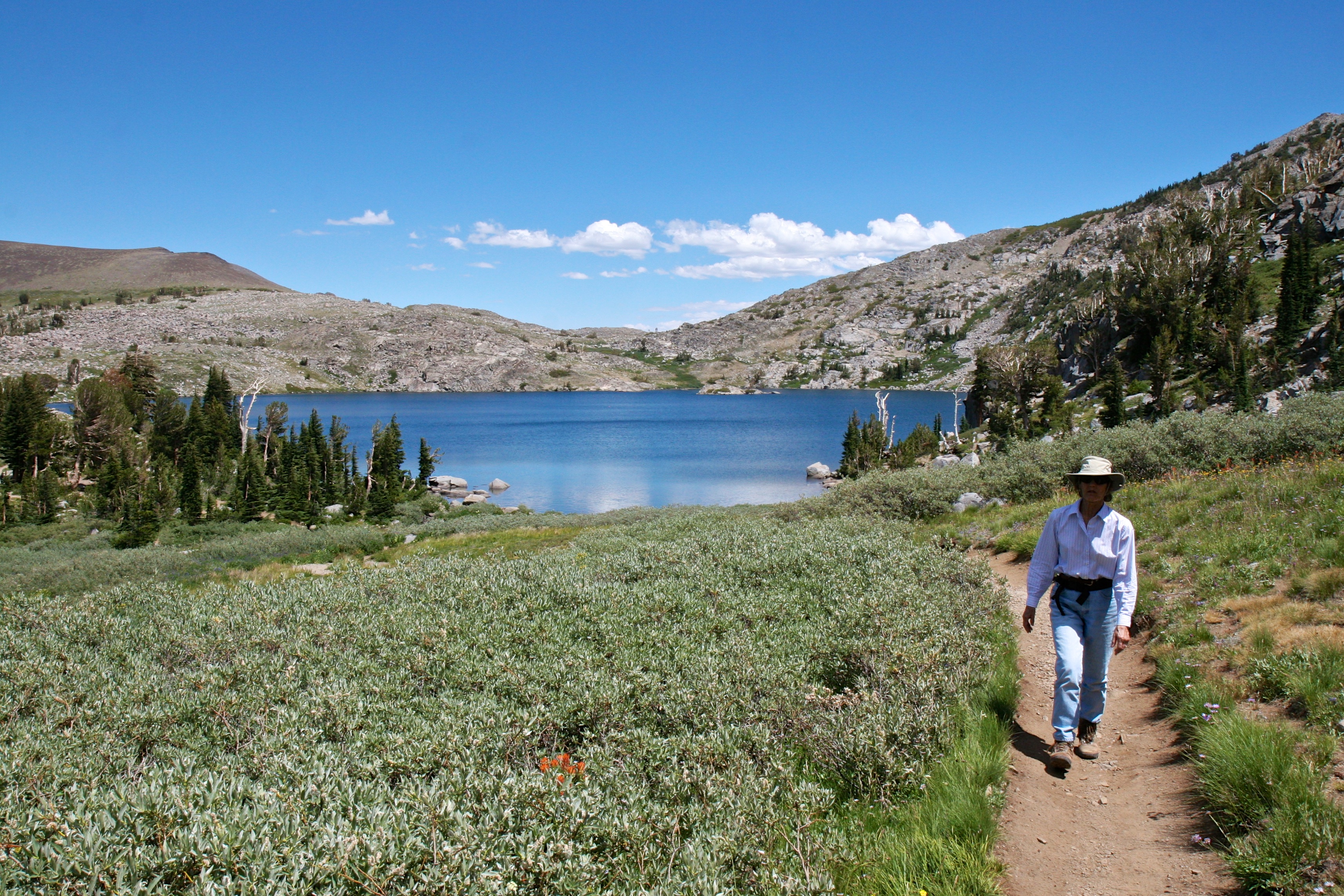 Today we drove up highway 88 to Carson Pass and parked at Wood’s Lake. We took the Winnemucca Lake trail (as we have done several times in the past). The wildflowers were blooming in profusion. After resting a bit at Winnemucca, we continue the climb up to Round Top Lake (around 9,300 ft elevation). We were debating about continuing down the Lost Mine Trail to return to Wood’s Lake (which we have never done because it always seemed so dry when we looked that direction). While talking, we greeted another couple who said it was a great hike, with lots of flowers. It was indeed, a wonderful hike down.