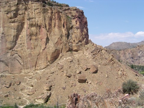 This is a portion of Smith Rock near Redmond, OR. It’s a favorite central Oregon climbing destination. We hiked the trail around to the right and climbed up to the top. Photo taken August 2006.