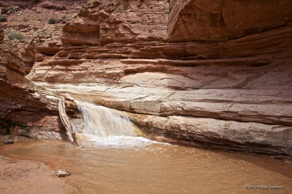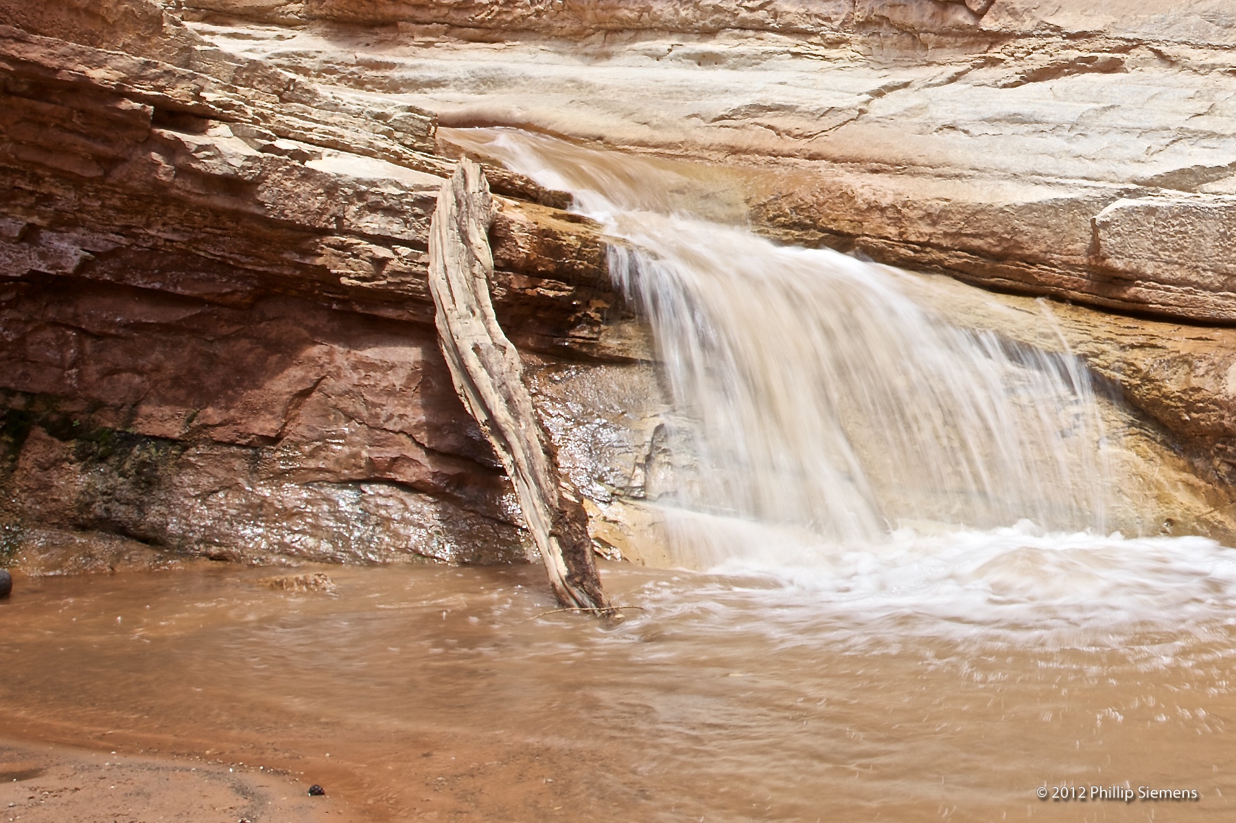 I think this is a remarkable photo, even though it just looks like a dirty waterfall on Sulfur Creek. First of all, this photo is hand held at 1/10 second exposure. I love Canon’s image stabilized lenses. Second, the grandkids had so much fun here. We had hiked up the creek, trying to keep our boots dry, until we were stopped by this 6 ft falls. It was passable with a little effort, but scary for the kids. On the way back, since we were all kind of wet anyway, we just waded in the creek. The canyon walls were high, so here’s an uncropped version of the photo to put it in context.The top of the canyon wall is far above. I sure would like to go back. I love southern Utah. Photo taken May 25, 2012.